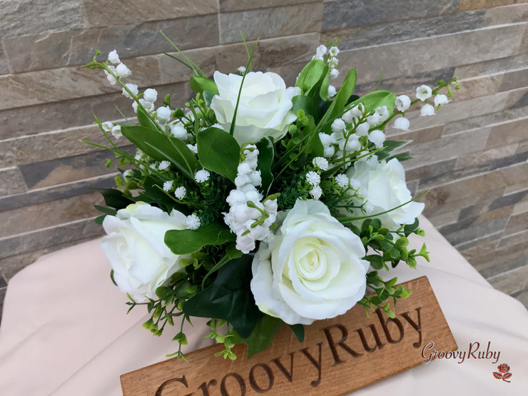 Ivory silk and foam roses with lily of the valley, gypsophila and foliage*.